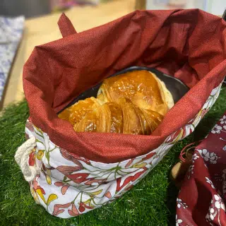 Le Sac à Pains version Corbeille s’invite sur la table de la salle à manger, tout en étant plus malléable qu’une corbeille rigide puisqu’une fois les pains et viennoiseries dégustés, il suffit d’y enlever le miettes et plier votre Sac à Pains pour le ranger dans un tiroir.